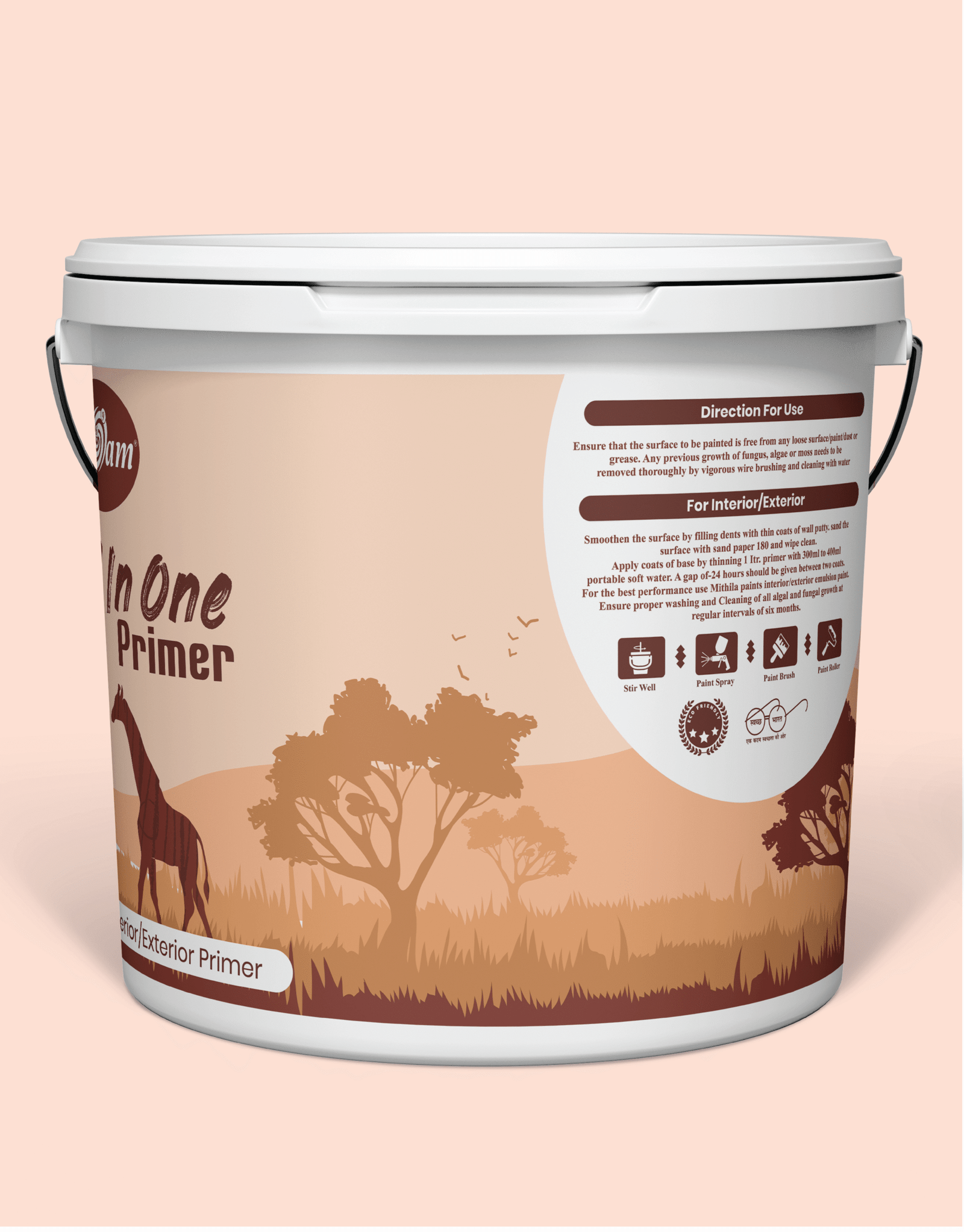 - For Interior: Smoothan the surface by filling dents with thin coats of wall putty. Sand the surface with sand paper 180 and wipe clean. Apply coats of primer by thinning 1 Itr. primer with 300ml to 500ml portabe soft water. A gap of 6-12 hours should be given between two coals. For the best performance of the paint. Ensure proper washing and of all alga and fungal growth at regular intervals of six months.